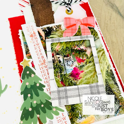 I then used the Mittens and Mistletoe thickers from the kit and placed two sentiments on the left side of the page and on the right side I used this Christmas tree and pink bow. I also used a couple of pieces from the Mittens and Mistletoe die cuts, including my journal piece and this cute black and white frame.