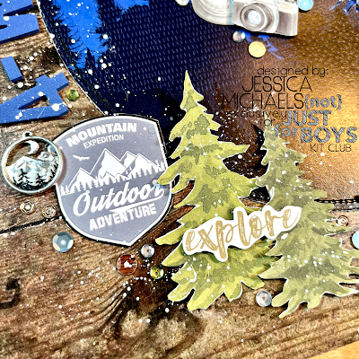 I actually started this one with a scraplift over at Paper Issues Facebook group. I loved Kim’s original circular layout and decided it would be perfect for this. I pulled out the woodgrain patterned paper to use as my main background, then I grabbed my circle cutter, cutting mat, and the background paper that looks like trees. I cut a 9 inch circle(or was it 10, I can’t remember!) and distressed the edges. I also grabbed my cutting blade and trimmed around the trees on one of the layers so I could tuck my photo into it. I then used my ATG gun to secure the circle to my woodgrain paper. I backed my photo with some textured black cardstock from my stash and then backed again with a scrap of the striped paper from this kit, distressing those edges with my edge distresser as well.